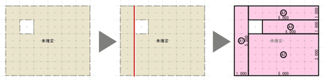 ※ 参照元の床面積区画は参照先に表示しません。 - 中庭など、穴あき形状のスペースを参照した場合は、穴がない形状に分割後、指定した分割方法で床面積区画が作成されます。