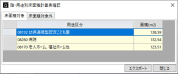 面積の大きいものから表示し、面積が等しい場合は用途区分の番号順(昇順)とします。 - 「エクスポート」をクリックすると、ダイアログの内容をExcelファイルに出力できます。
