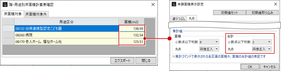 「申請面積表示設定」の「丸め」タブにある「集計値-合計」の設定が連動します。