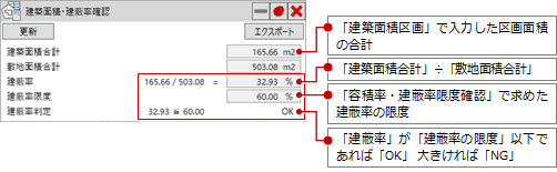 「建築面積区画」で入力した区画面積と敷地面積から建蔽率を求め、
