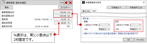 「申請面積表示設定」の「丸め」タブにある「集計値-合計」の設定が連動します。