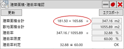 「建築面積」をクリックします。- 「建築面積・建蔽率確認」パネルで建築面積や建蔽率、判定を確認します。