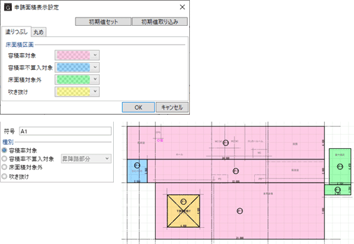 「申請面積」で使用する床面積区画の塗りつぶしや、距離・面積などの小数点以下桁数と丸め方法を設定します。図面・GLOOBEシートの確認申請図の作図表現としても使用できます。