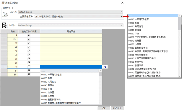 - 階によって用途区分が異なる場合は、対象階の「建物グループ参照」のチェックをOFFにして用途区分を設定します。