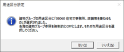 はい 全階の「建物グループ参照」のチェックがOFFになります。各階の用途区分を設定してください。 いいえ 建物グループの主要用途区分が「----」になります。 - 階ごとの用途区分では、「08060 住宅で事務所、店舗等を兼ねるもの」は表示されません。