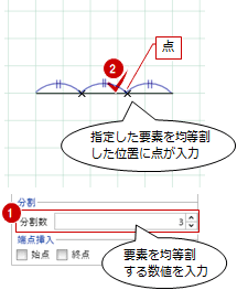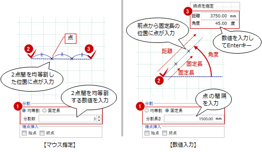 - どちらの入力方法でも、コマンドサポートウィンドウの「分割」で点の位置を指定する線分の分割方法を選択できます。