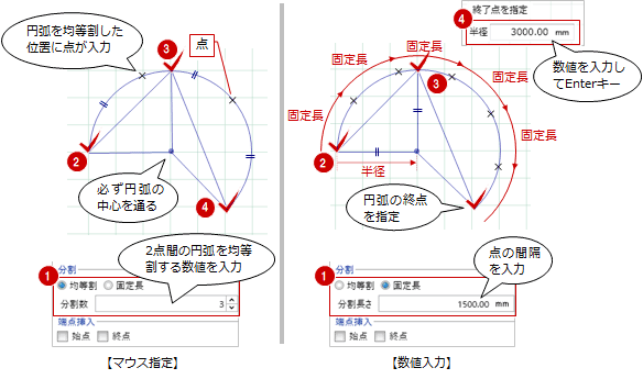 - どちらの入力方法でも、コマンドサポートウィンドウの「分割」で点の位置を指定する円弧の分割方法を選択できます。
