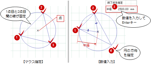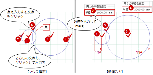 - 指定した2円の交点が複数でない場合、2円を指定した時点で交点に点が入力されます。