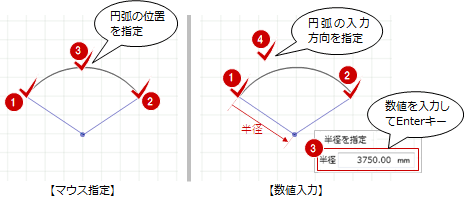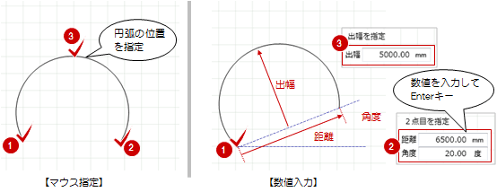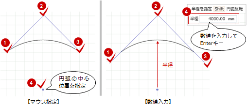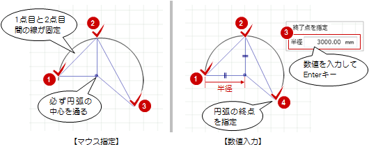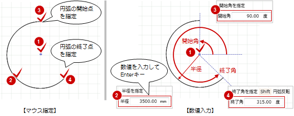 - Shiftキーを押しながら円弧の終了点を指定すると円弧が反転します。