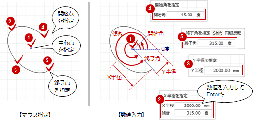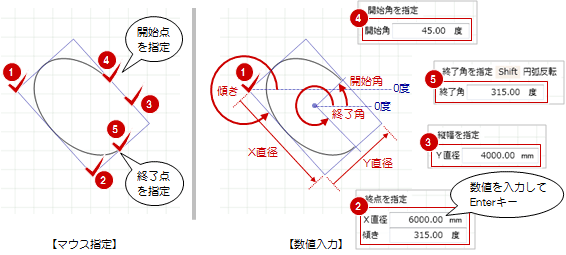- Shiftキーを押しながら楕円弧の終了点を指定すると円弧が反転します。