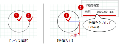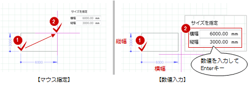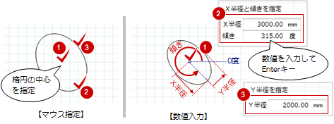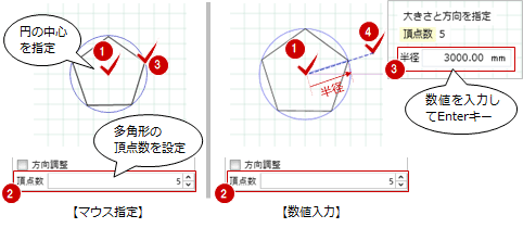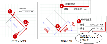 - コマンドサポートウィンドウの「方向調整」にチェックを付けると、マウスで大きさを指定した後、方向を指定することができます。