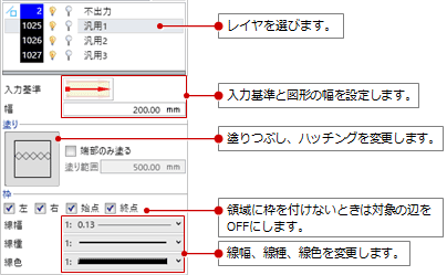 「線状塗り」メニューで入力する図形を、塗りつぶしやハッチングなどでどのように表現するかは、コマンドサポートウィンドウの「塗り」で設定します。