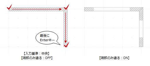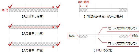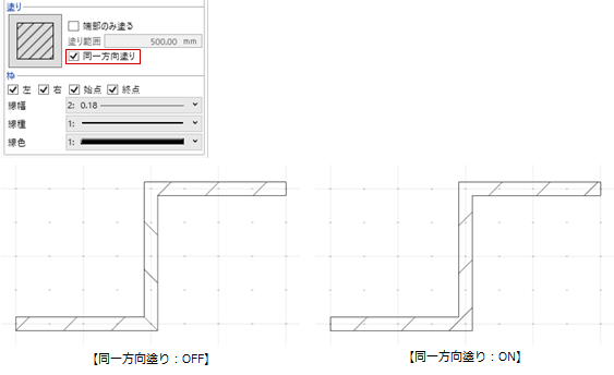 - 「ハッチング(システム)」がONの場合、「同一方向塗り」を設定することができます。「同一方向塗り」がONの場合、異なる向きの線状塗りを入力してもハッチングは同じ方向で描画されます。