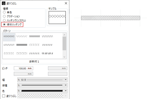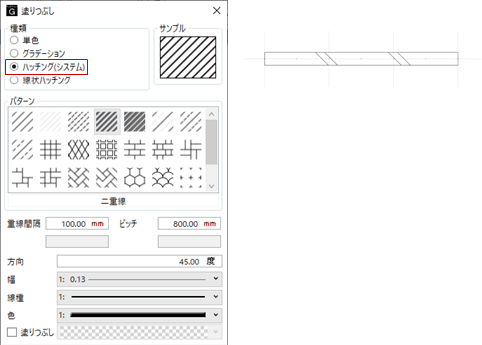 線状塗りにハッチングを表現する場合は、「ハッチング(システム)」をONにします。
