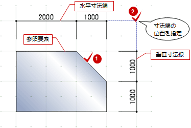- 「多角」メニューで入力した図形の場合、1辺に対しての水平寸法線と垂直寸法線が入力されます。