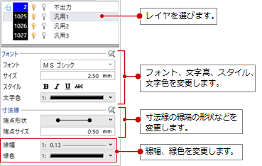 - フォント、寸法線の詳細設定については、「フォント/文字の設定」「寸法線の設定」を参照してください。