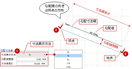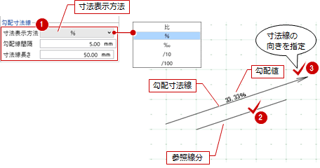 - コマンドサポートウィンドウの「寸法表示方法」で「比」を選んだ場合、勾配線は表示されません。