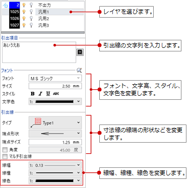 「引出線」をクリックします。- 入力するレイヤを選び、引出項目やフォント、タイプなどを設定します。