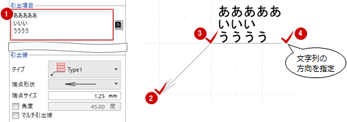 については、「文字列マスタについて」を参照してください。 - 引出線のタイプ、端点形状、端点サイズについては、「複数段の引出線を描くには」を参照してください。