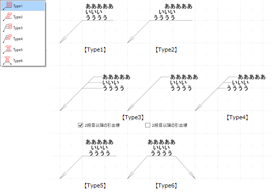 - コマンドサポートウィンドウの「引出線」にある「タイプ」は、次の複数段のタイプを選択できます。