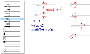 - コマンドサポートウィンドウの「引出線」にある「端点形状」で、線端の形状を設定できます。