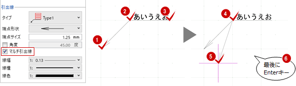 引出線を入力後、複数の矢印を追加する操作になります。Enterキーで確定します。