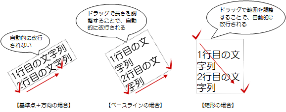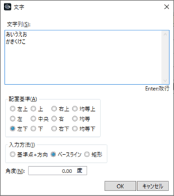 - 「角度」では、1点配置するときのテキストの角度を設定します。「矩形」がONの場合は、ドラッグで指定する矩形の範囲が傾きます。