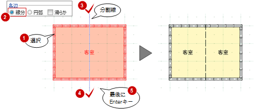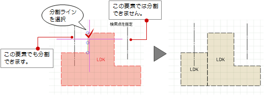 - 主に2D汎用の線分やスペースなどの領域、指定した線分の位置で分割したい場合、