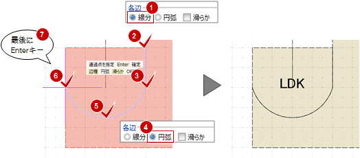 - 分割ラインを円弧に切り替えるには、同点にマウスをクリック、またはコマンドサポートウィンドウの「円弧」をONに切り替えます。