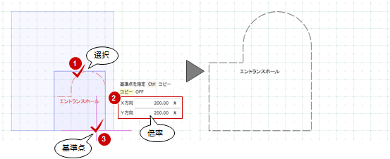 - Ctrlキーを押しながら伸縮後の基準点をクリックすると、コピーになります。