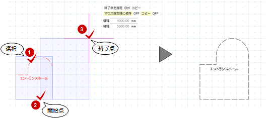 - Ctrlキーを押しながら伸縮範囲の2点目をクリックすると、コピーになります。