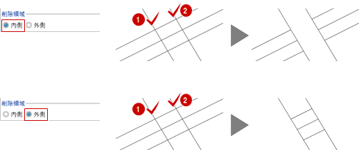 「線分間削除」を選びます。 - 線分の内・外どちらを削除するか設定します。