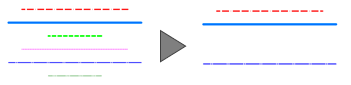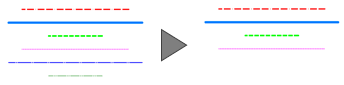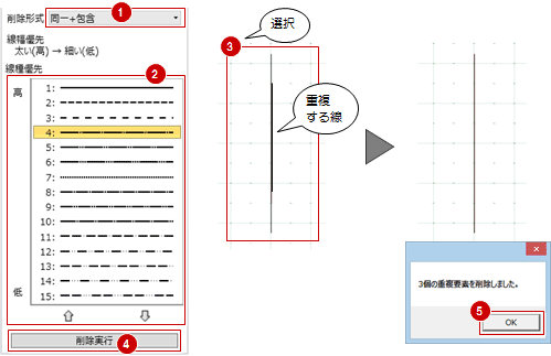 - 次のような線幅、線種のデータが重なっている場合、「削除形式」によって処理内容が異なります。