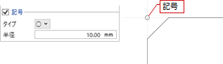 - 隅取り部分に記号を付けるには、「記号」をONにします。