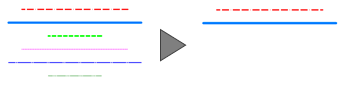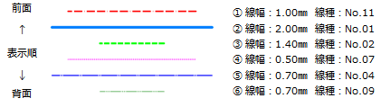 | 包含 | 長い要素に短い要素が含まれている場合、優先順位の高い線分を基準に、包含した線分のうち優先順位および表示順の低いものが削除されます。この場合、一番優先順位の高い②が基準になります。 ⑤は、②と長さが同じため残ります。 ①は、②より短いですが、表示順が前面にあるため残ります。 ③④⑥は、②に包含され、かつ優先順位が低いため、削除されます。 ![]() |
