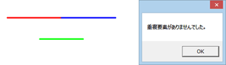 - 次図のように、同一線上にある2つの線分をまたぐ線分があった場合、見た目では重複した状態ですが、「同一」「包含」どちらの条件にも該当しないため、重複削除の対象となりません。