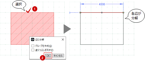 「辺に分解」を選びます。 - 分解する領域をクリックします。