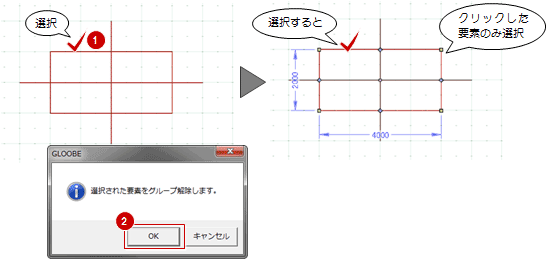 - グループがすべて解除されるのは、アクティブな図面のみです。他の図面のグループを解除したいときは、その図面をアクティブにしてから