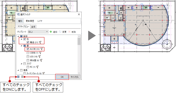 - スラブ、柱、壁、梁などの躯体オブジェクトや建具では種別、カタログ部品では分類別に選択できます。