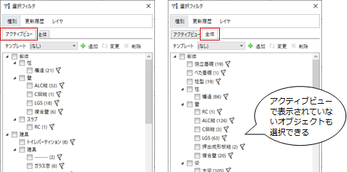 - 「全体」タブをクリックすると、アクティブビューで表示されていないデータも選択できます(汎用2Dデータはアクティブビューのみ対象)。