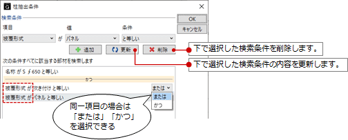 検索条件が同一項目の場合は、OR検索(または)とAND検索(かつ)を選択できます。