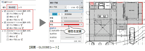 ある日時以降に変更・追加したデータを確認したり、その線データを図面(GLOOBEシート)にて赤色に変更し、変更前の図面と比較しやすいように印刷したりして利用できます。