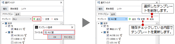 - 選択フィルタの条件をテンプレートに保存するときは、