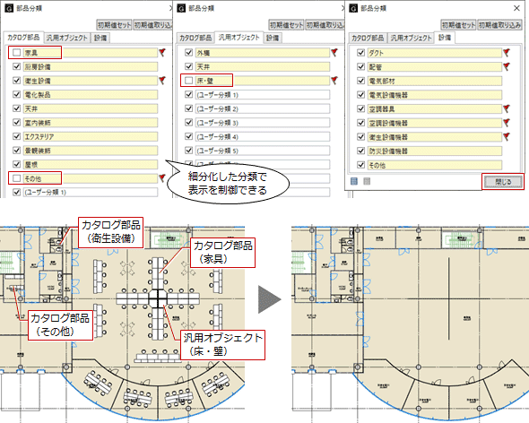 カタログ部品、汎用オブジェクト、設備について、細分化した分類ごとにビューでの表示状態を制御します。