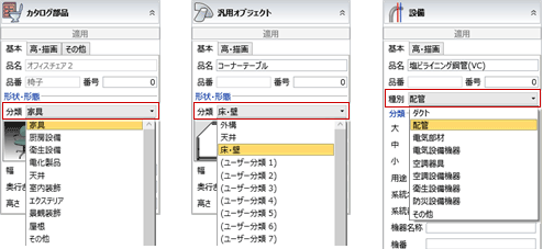 が表示されます。 - カタログ部品、汎用オブジェクト、設備の分類は、プロパティ「基本」タブの「分類」「種別」で変更できます。