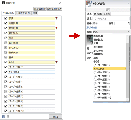 カタログ部品は10種類、汎用オブジェクトは20種類のユーザー分類名を設定できます。