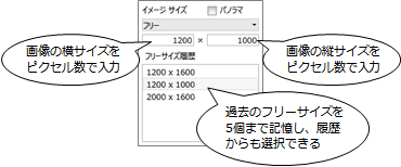 | フリー | 作成する画像サイズを設定します。(最大値:10000×10000)![]() ※ フリーサイズの履歴を削除したいときは、サイズを選択して右クリックし、「削除」を選びます。 |