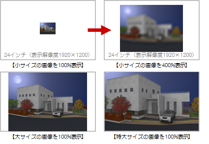 解像度より小さい大きさの画像を作成すると、拡大したときにぼやけて表示されます。また、大きいサイズほど、ファイルサイズが大きくなります。