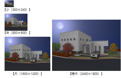 3Dビューの表示サイズを基準に選択します。 「画面モニタサイズ×1.0」は表示されている3Dビューと同じ大きさ、「画面モニタサイズ×2.0」は表示されている3Dビューの大きさを2倍にしたサイズの画像にします。 ![]() |
