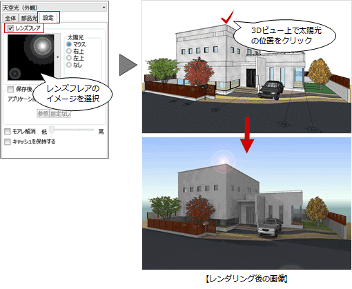 外観パースに太陽光をイメージするレンズフレアを表現するには、「設定」タブで「レンズフレア」をONにします。